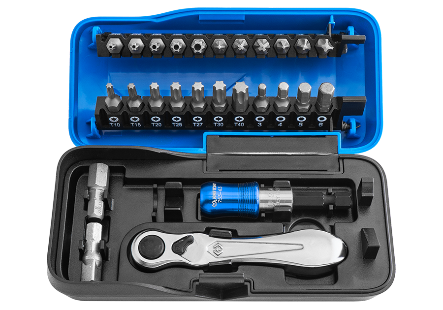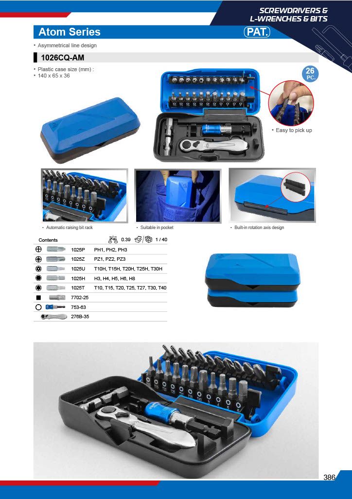KT1026CQ-AM | King Tony 26 PC. 1/4 inch DR. Mini Bit Ratchet Set 26 PC. 1/4in Mini Bit Ratchet Set Atom Series, asymmetrical line design Automatic raising bit rack, easy to pick up Suitable in pocket Built-in rotation axis design