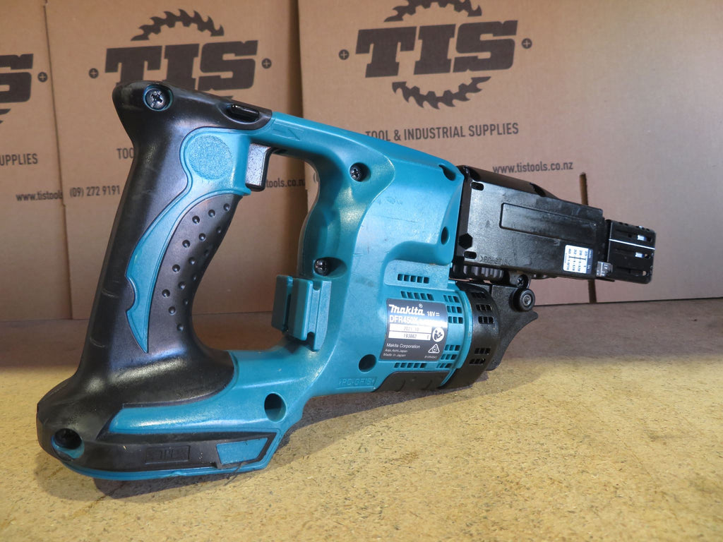 This listing is for a Makita Ex Demo DFR450ZX 18V LXT Auto-feed Screw Driver - Good Condition