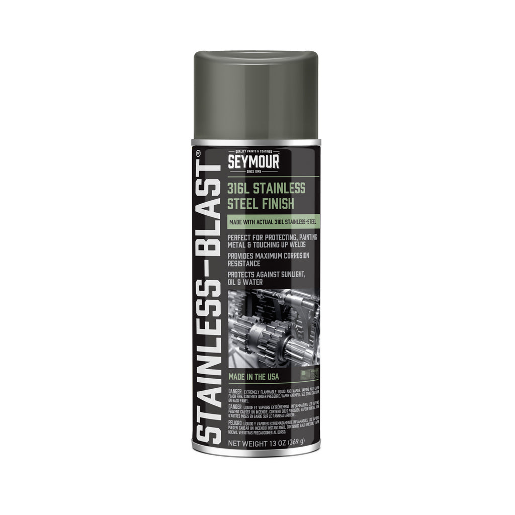 CA16-54 SEYMOUR AEROSOL 316L STAINLESS-BLAST STAINLESS-STEEL FINISH A special formulation containing 316L stainless-steel mixed in with pigment to provide maximum corrosion resistance and protection against weather, sunlight, oil, and water. Dries to a satin finish. Recommended as a topcoat, not a primer. Use of a primer is always beneficial to enhance adhesion and overall durability. Dries quickly, is non-yellowing, and heat resistant up to 250 degreeF (120 degree C).