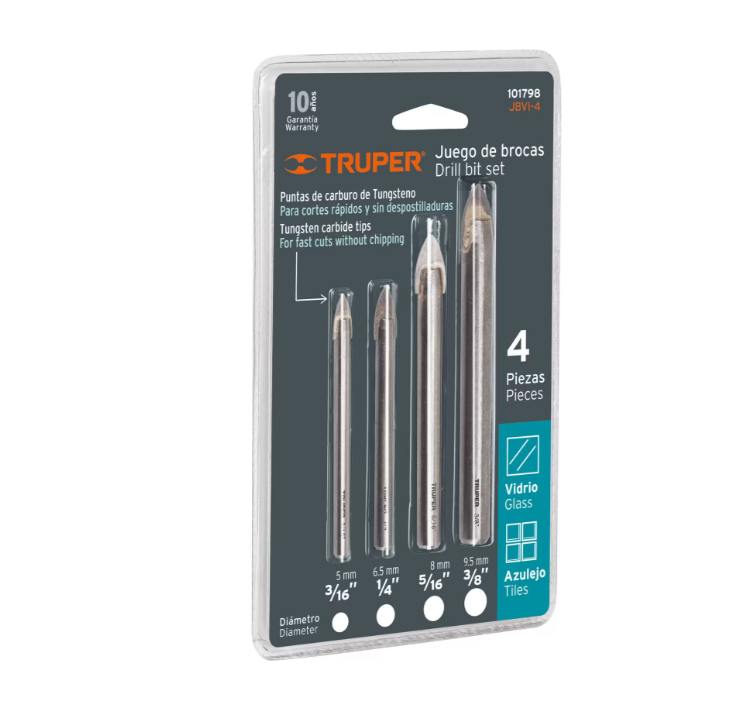 TGLASS4 | Truper Glass & Tile Drill Set 3/16",1/4",5/16",3/8 4 pce