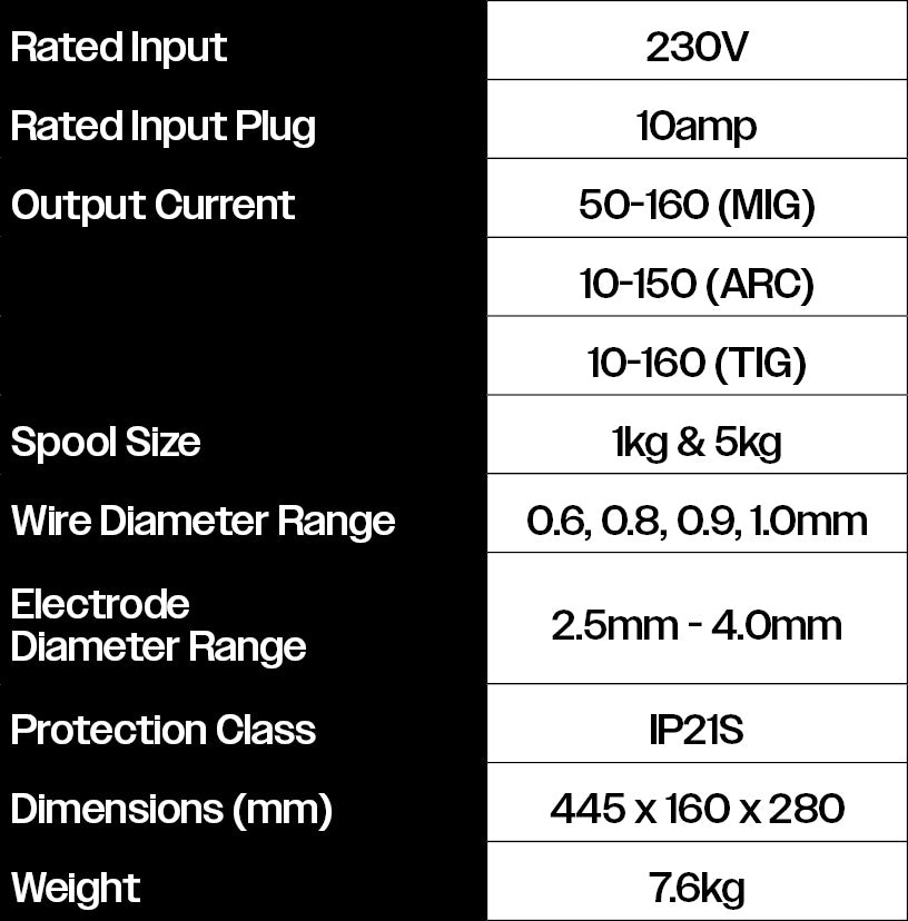 Designed with the home welder in mind, delivering exceptional versatility and user-friendly performance. Whether you’re tackling ARC, MIG or TIG welding, all on a 10 amp plug.